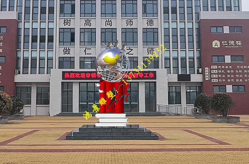 雕塑說明:雕塑整體采用不銹鋼材質制作,外噴氟碳漆,雕塑下方由書本組成,書中鏤空造型寓意少年在奮斗拼搏中綻放光芒,用不懈的拼搏成就夢想。上方由地球儀組成,代表著要志存高遠,腳踏實地,讓成長的腳步更加堅定有力。